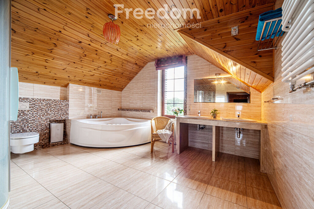 - Stylowy pokój kąpielowy z wanną z hydromasażem, prysznicem,